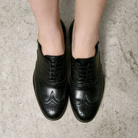 Die Judy Oxford-Schuhe in Schwarz werden in Italien von den erfahrenen Kunsthandwerkern von ETIQL handgefertigt und verkörpern klassische Eleganz mit einem Hauch von Charakter. Dieser Oxford mit runder Spitze aus glattem, schwarzem italienischem Kalbsleder ist mit Brogue-Flügelspitzendetails verziert. Er wurde in Blake-Bauweise gefertigt und mit einer Ledersohle versehen – für zeitlose Eleganz, Flexibilität und Komfort im Beruf und in der Freizeit.