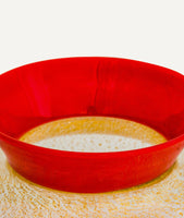 Die Kunst von Murano, von bekannten zeitgenössischen Glaskünstlern, wird ihren Wert nicht nur bewahren, sondern auch steigern. Die Transparenz der rubinroten und elfenbeinfarbenen Kristallvase mit Goldfolie und rotem Einsatz macht das Licht zu einem zentralen Bestandteil der Vase. Das Licht als ständig wechselnde Komponente macht sie zu einem besonderen Blickfang.