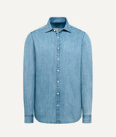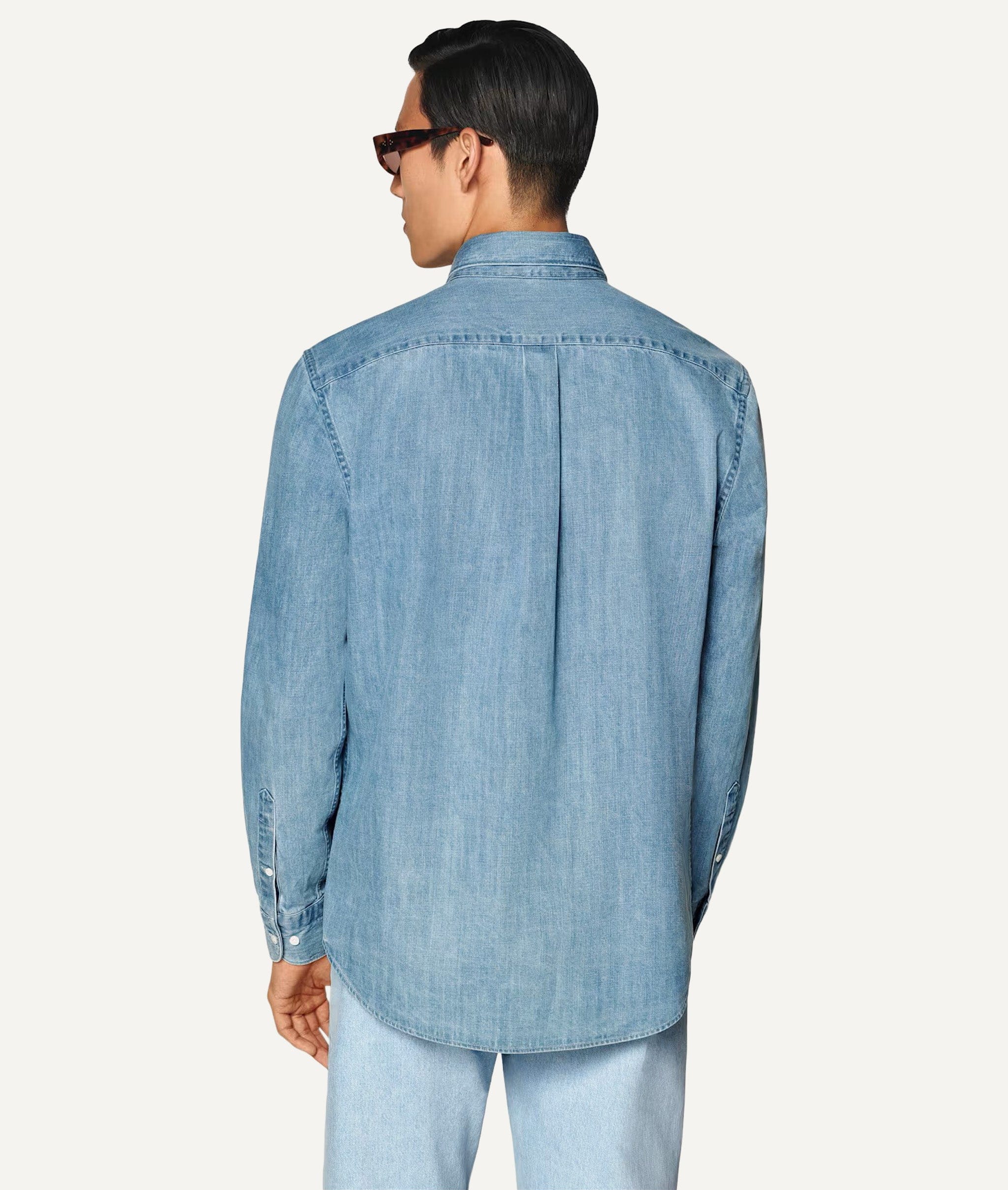 Handcrafted in Italy, the Denim Shirt is made from a lightweight 4.5 oz denim blend at 160 gr/m². Composed of 98% cotton and 2% elastane, the fabric offers a soft textured hand, comfortable stretch and a refined casual drape, creating a versatile everyday piece with modern ease and understated character.